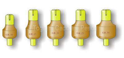 Special plummets with push-button device that grips directly on the hook without damaging the line, protecting the hook point from entanglement. Made of brass w