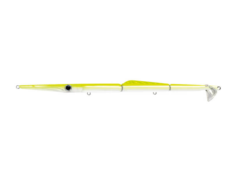 Il Kàbo AGUGLIA JOINTED 255 di Jatsui è un needle bait snodato da 255 mm progettato per la pesca ai grandi predatori pelagici. La struttura multi-segmento garantisce un movimento estremamente naturale, replicando con precisione il nuoto rapido e irregolare dell’aguglia in fuga.