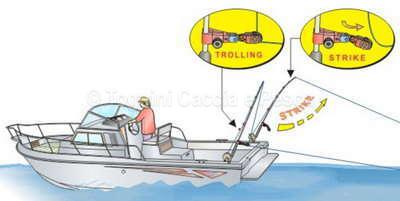 Dispositivo di sgancio della lenza per la traina di superficie. Mantiene il filo basso sulla superficie dell’acqua facendo “lavorare” meglio le esche. Brevettato.
