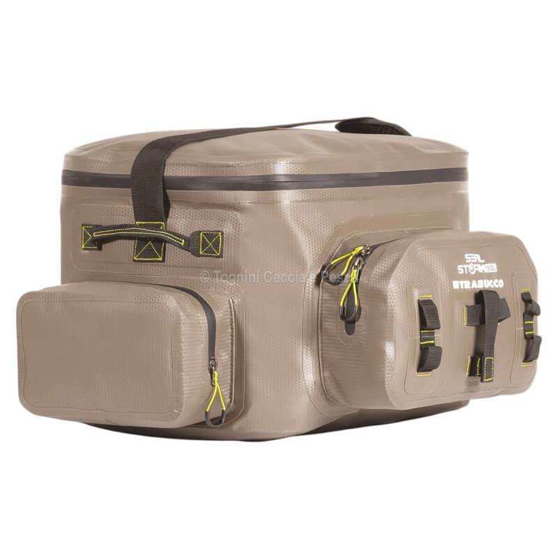 Trabucco Seal Strom Tackle Bag 35L: Zaino stagno con cerniere gommate e apertura superiore. 2 tasche laterali stagne porta scatole e tasca frontale ermetica.